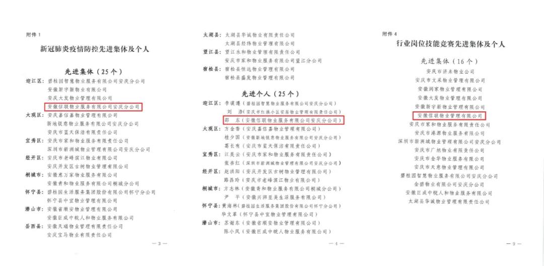 1月18日,中共安慶市物業(yè)行業(yè)委員會(huì)發(fā)布《關(guān)于表彰新冠肺炎疫情防控等工作先進(jìn)集體和個(gè)人》通報(bào)文件,對(duì)全市2020年奮戰(zhàn)在新冠疫情防控等工作表現(xiàn)突出的先進(jìn)集體和先進(jìn)個(gè)人予以通報(bào)表彰,安徽信聯(lián)物業(yè)安慶分公司榮獲多項(xiàng)先進(jìn)集體及先進(jìn)個(gè)人稱(chēng)號(hào)。