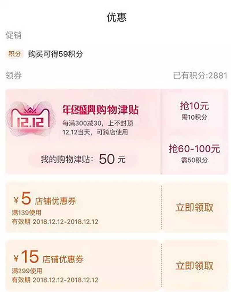 雙12期間,無論活動再多,一定要先!領!津!貼!點開淘寶首頁點擊進入雙12主會場或在“我的淘寶”界面點擊“紅包卡券”-“購物津貼”,就可以通過天貓積分余額搶到10元~100元不等的滿減優(yōu)惠券啦!