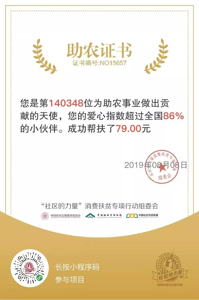 05購買農產品成功后,您會獲得《助農證書》,成為助農事業做出貢獻的天使,最后可以分享給您的朋友,讓更多的人知道您的愛心,邀請他們一起為扶貧助力!